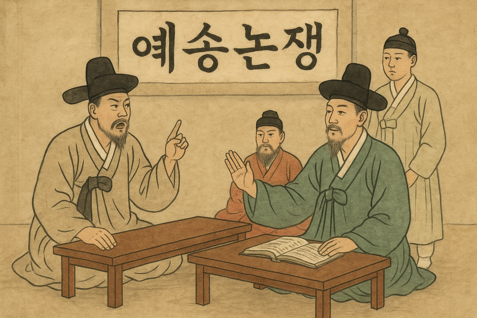 ● 예송논쟁(禮訟論爭) : 주자가례(朱子家禮)를 바탕으로 하는 성리학 예법을 엄격히 지키는 조선 사회에서는 부모, 형제, 왕족이 사망했을 때 얼마 동안, 어떤 옷을 입고 상을 치를지는 매우 중요한 문제였습니다. 현종 시기에 발생한 예송논쟁은 상복기간을 둘러싼 정치적 학문의 논쟁으로 외적으로는 예법(장례 규범)을 어떻게 적용할지에 대한 문제였지만, 실적으로는 서인과 남인 두 정치 세력의 권력 다툼이었습니다.